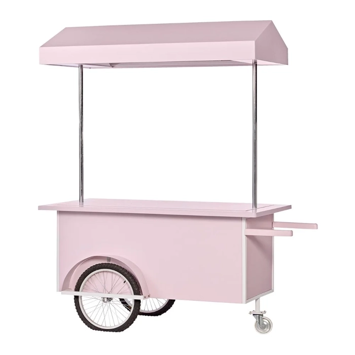 Designed for both indoor and outdoor utility, this durable mobile vendor cart features a spacious countertop and a sturdy awning. The clean, monochromatic look provides a contemporary backdrop for beverage or food service, while the available custom branding allows you to seamlessly integrate it into your promotional activities.