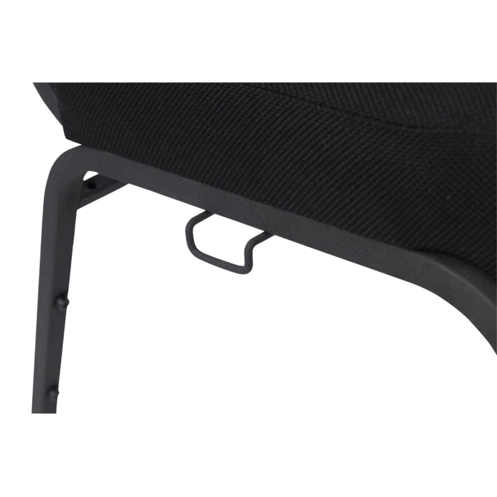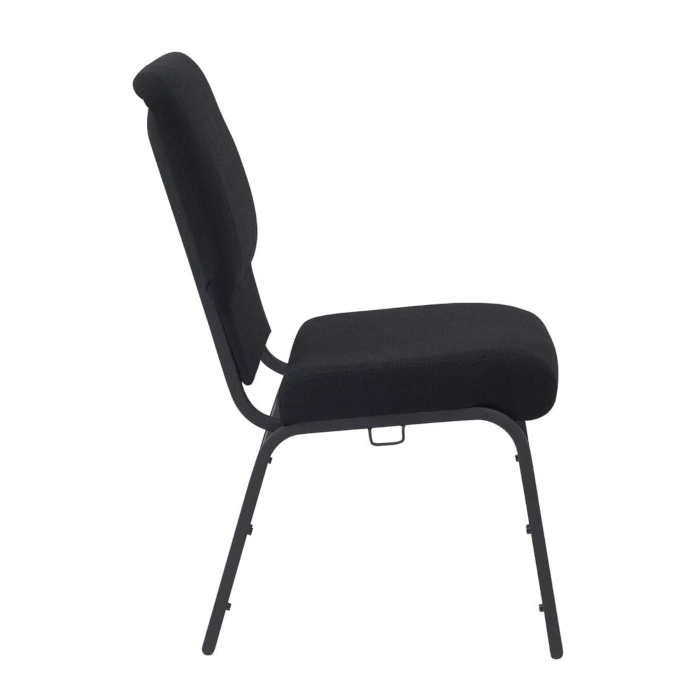 Church chair has black fabric upholstery and dark gray steel frame armless design for function and style cut-away back for ergonomic comfort suitable for commercial worship spaces durable safe and stackable