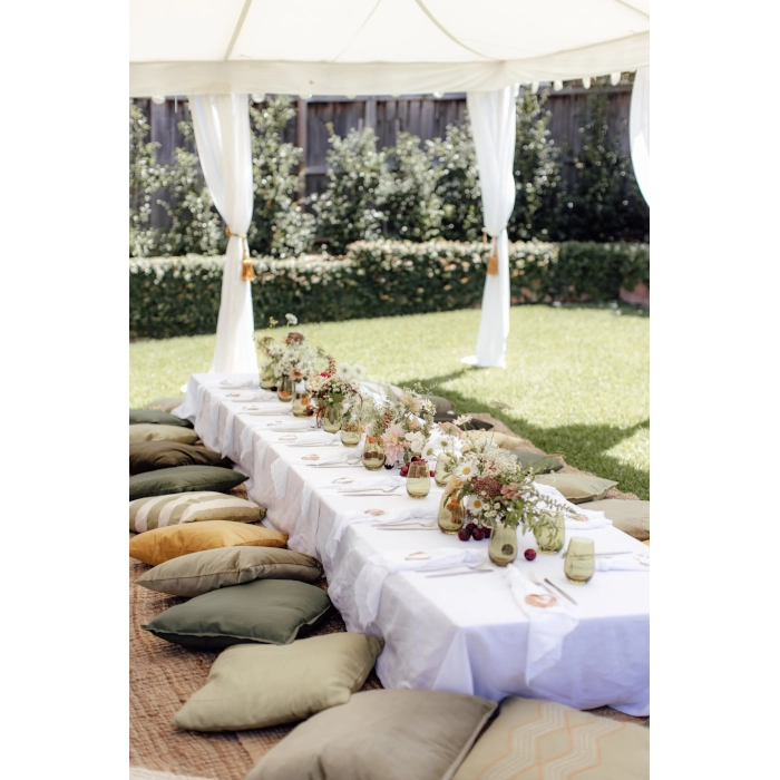 Set the scene for a relaxed event with our oak brown timber low trestle table. Its natural color and low profile are ideal for styling vibrant, comfortable gatherings with cushions and blankets.