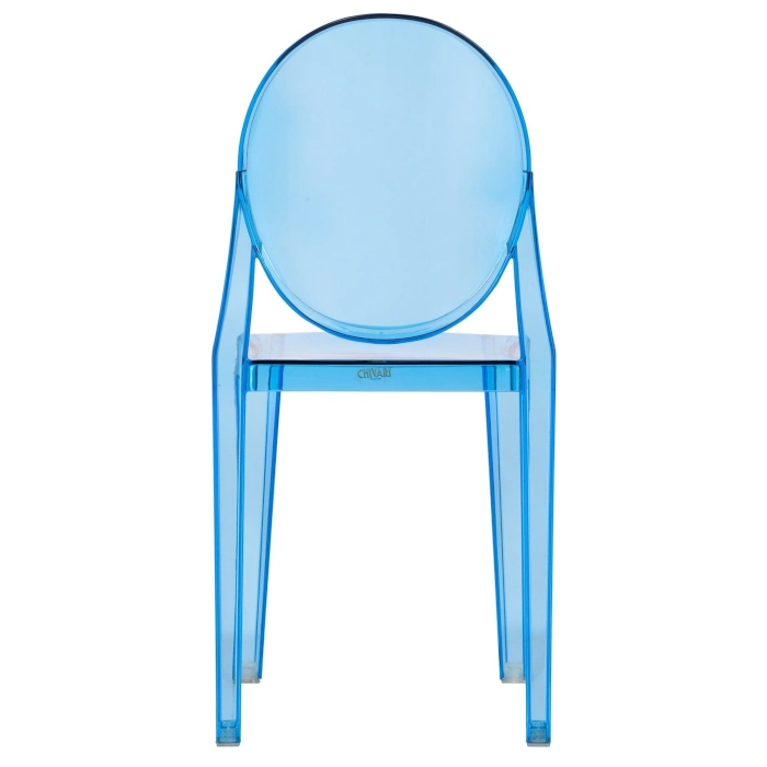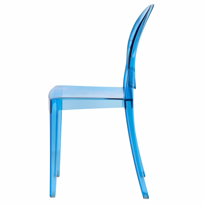 A bright blue transparent resin chair that is playful and practical It is tough scratch resistant and easy to clean The Victorian inspired shape adds style to classrooms play areas and parties while being lightweight enough for children to handle