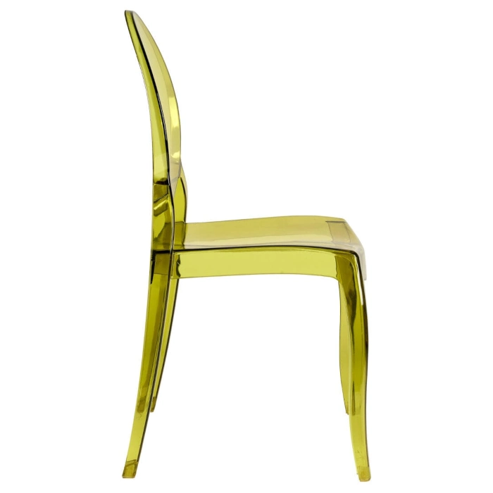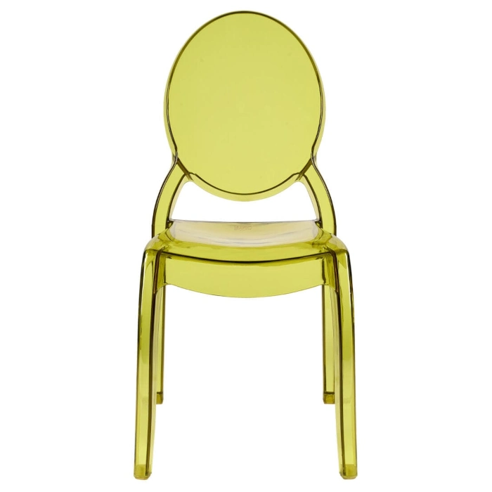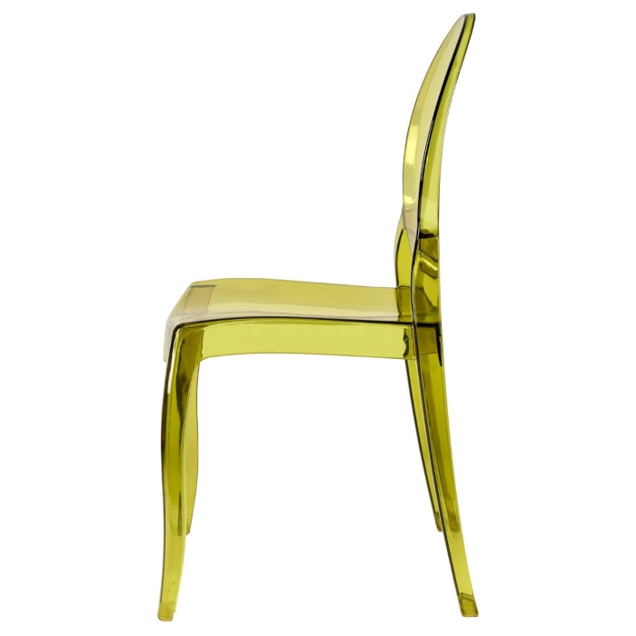 A transparent green resin chair inspired by the Sophia design It features a wider seat for added comfort made from strong lightweight polycarbonate scratch and stain resistant easy to clean and stackable suitable for both indoor and outdoor use with a sleek modern appearance